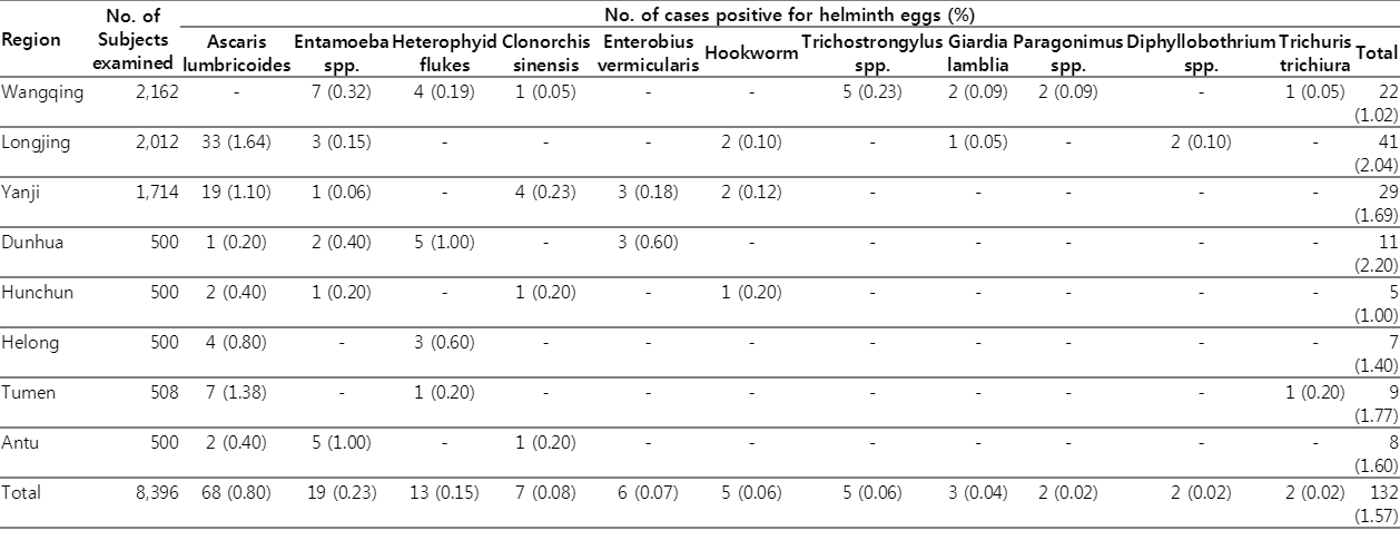 Fig. 1). Fecal specimens were collected from 8,396 inhabitants selected from the 8 regions (6 cities and 2 counties). These specimens were transferred to the laboratories of the Yanbian Center for Disease Control and Prevention for analyses. The formalin-ether sedimentation technique was used to determine the presence of helminth eggs and protozoan cysts, and for 8,396 inhabitants, cellotape anal swap was used to detect the presence of
