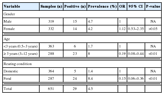 D. immitis, and the independent variables were gender (male, female), age (<3 years, ≥3 years), and rearing condition (domestic or feral). Seroprevalence with the odds ratio (OR), 95% confidence intervals (CI) and