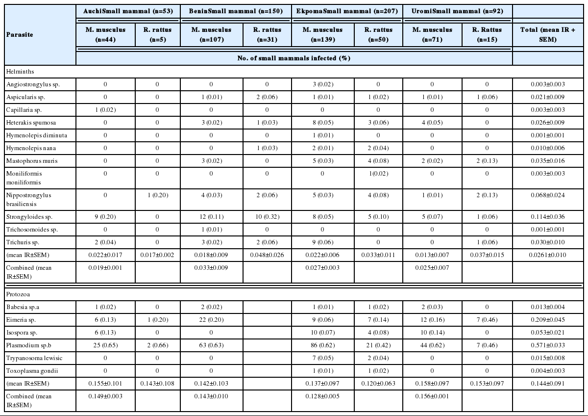 The prevalence of M. musculus and R. rattus with 2 or more helminth taxa against the total number of helminth-positive small mammals per location was: 4 (26.7%) and 1 (33.3%) in Auchi, 18 (46.2%) and 8 (53.3%) in Benin, 13 (31.0%) and 11 (68.8%) in Ekpoma and 10 (55.6%) and 5 (71.4%) in Uromi, respectively. The number of R. norvegicus in which 2 or more helminth parasites were isolated was: Benin (n=3), Ekpoma (n=8), and Uromi (n=7). In Ekpoma, M. natalensis (n=1) and Sorex sp. (n=1) were positive of 2 helminth taxa with similar result for Apodemus sp. (n=1) (Uromi=data not presented).