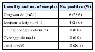 Sarcocystis parasites was 26.3% (10 out of 38 samples of the Korean water deer). Among the 38 collection sites in the ROK, 6 infection muscles (15.8%) were detected in the provinces of Gangwon, Gyeonggi, and Chungcheongbuk-do, and 4 infection samples in Daejeon city (10.5%), respectively. Furthermore, identification of the parasite that is collected from the Korean water deer was examined by molecular method. In previous study, molecular technique could identify a single species of the parasite from the host animal tissues and distinguish individual species from other parasites of