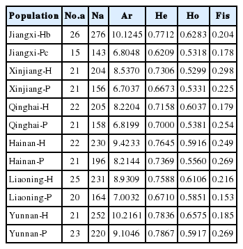 There were 2,435 alleles at 20 microsatellite loci in the 12 populations. The number of alleles observed (Na) per population varied from 143 to 276 (