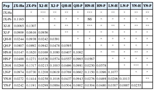 The pairwise Fst in the 12 populations ranged from 0.0065 to 0.1620, with a global value of 0.0567. The greatest genetic variation was observed in the populations HN-H and JX-P, whereas the least differentiation was in XJ-H and JX-H. The Fst in human