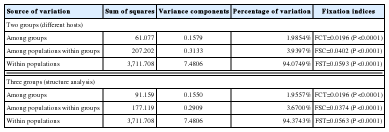 28] in the Structure Harvester program. Arlequin ver. 3.11 was used for a hierarchical analysis of molecular variance (AMOVA) [