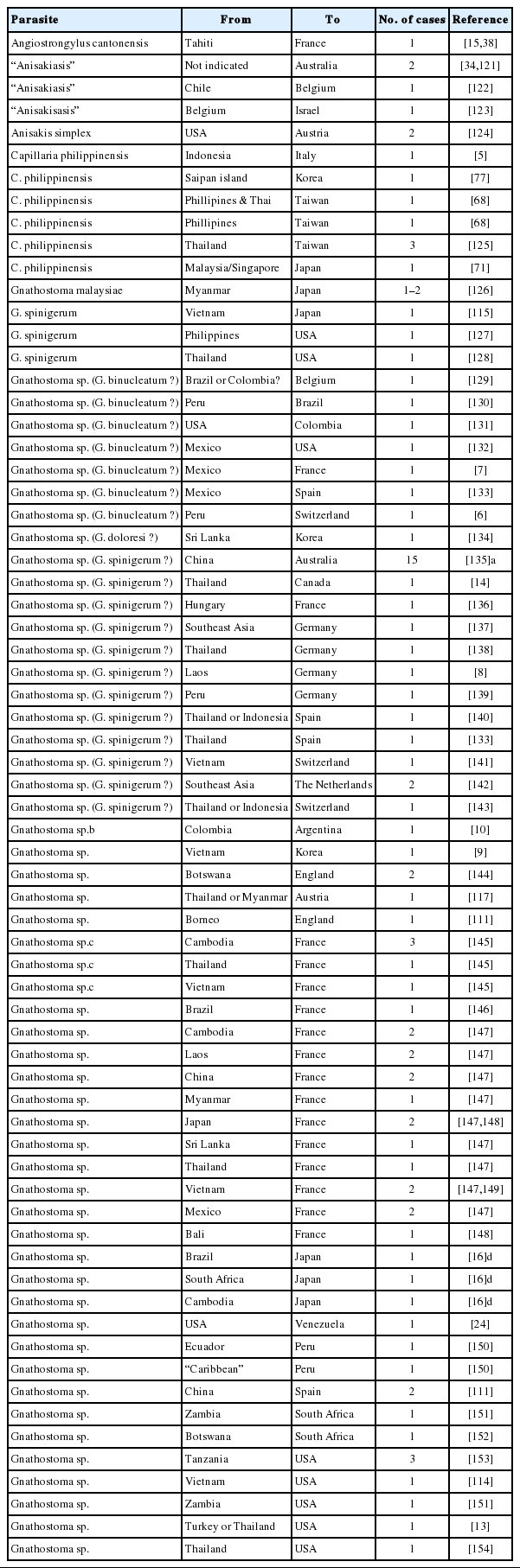 15] presented a list of imported gnathostomiasis to western countries (immigrants and travelers) since 1980 by chronological order of the reports, listing 42 cases.