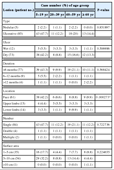 Considering the leishmanial lesions, examined, all were confined to the patients’ skin with no mucosal tissue involvement noticed. The mean number of lesions was 1.08±0.356 (mean±SD) and the mean surface area of 6.35±3.01 cm2. The lesion’s evolution time ranged between 3 and 15 months (mean±SD=5.96±2.53). The majority of lesions were of 3–6 months durations (85.5%). Most of the patients (84; 93.3%) presented with single lesion, while 6 patients developed 2–3 lesions. The highest proportion of lesions (85; 94.4%) was of ulcerative type while 5.5% of lesions were nodular. Lesions affected exposed body parts, mainly the face (61; 67.7%), followed by the upper limbs (15; 16.6%) and the lower limbs (14; 15.5%). Table 2 shows the clinical features of the leishmanial skin lesions relative the different age groups. The mean surface areas of lesions were below 5 cm in 35 (38.8%) of cases, 5–10 cm in 54 (60%) patients and more than 10 cm in just one case. The ulcerative lesions looked dry with scales in 85.8% (73/85) and wet in 14.1% (12/85) of cases. The lesions were exclusively-found on exposed body areas: the face in 67.7%, the lower limbs in 15.5%) and the upper limbs in 16.6% of patients. The facial lesions were found frequent in young patients below 19 years (38/61; 62.2%), while the limbs lesions were described more in older ages (≈ 86%), with highly significant differences observed among the patients age groups (P =0 .000273, chi-square).