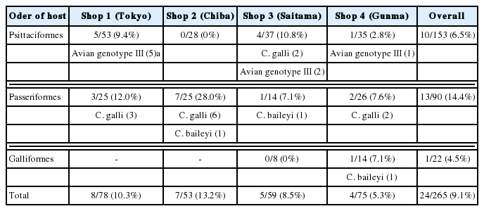 Between March 2015 and May 2016, a total of 265 fresh voided fecal samples were collected on a single occasion from each birdcage (birds of a single species were kept in each cage) in 4 pet shops (Shop 1–4) located in the Kanto region, which includes the prefectures of Tokyo (Shop 1; n=78), Chiba (Shop 2; n=53), Saitama (Shop 3; n=59), and Gunma (Shop 4; n=75), in Japan. All pet shop managers granted permission to include their birds in the examination. The birds belonged to 41 species in 3 orders (Psittaciformes, Passeriformes, and Galliformes). The fecal samples were collected immediately after natural defecation and were stored at 4°C prior to DNA extraction (within 3 days). The extraction of Cryptosporidium spp. DNA was performed using a QIAamp DNA Mini Kit (QIAGEN GmbH, Hilden, Germany) according to the manufacturer’s instructions, and the extracted DNA samples were stored at −20°C prior to analysis.