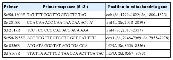 Two sets of species-specific primers were designed to generate species-specific PCR products of different size based on the nucleotide sequences of cytochrome b (cob), NADH dehydrogenase subunit 4L (nad4L), NADH dehydrogenase subunit 4 (nad4), cytochrome c oxidase subunit 1 (cox1), and large subunit ribosomal DNA (lrDNA) from S. erinaceieuropaei and S. decipiens. The forward primer was designed from a highly conserved region in cob gene, Se/Sd-1800F (5′-AGTTATTTTCGGTTGGTGCTGTAG-3′; nucleotides 1799 to 1822 from KJ599679 and nucleotides 1800 to 1823 from KJ599680). The 2 reverse primers were designed to amplify products of different length as follows: Se-2018R, specific for S. erinaceieuropaei (5′-CCACAAACCCAATAACAAACTA-3′; nucleotides 2018 to 2039 from KJ599680); and Sd-2317R, specific for S. decipiens (5′-TCCTCCCCCCACACGACAAAA-3′); nucleotides 2317 to 2337 from KJ599679.