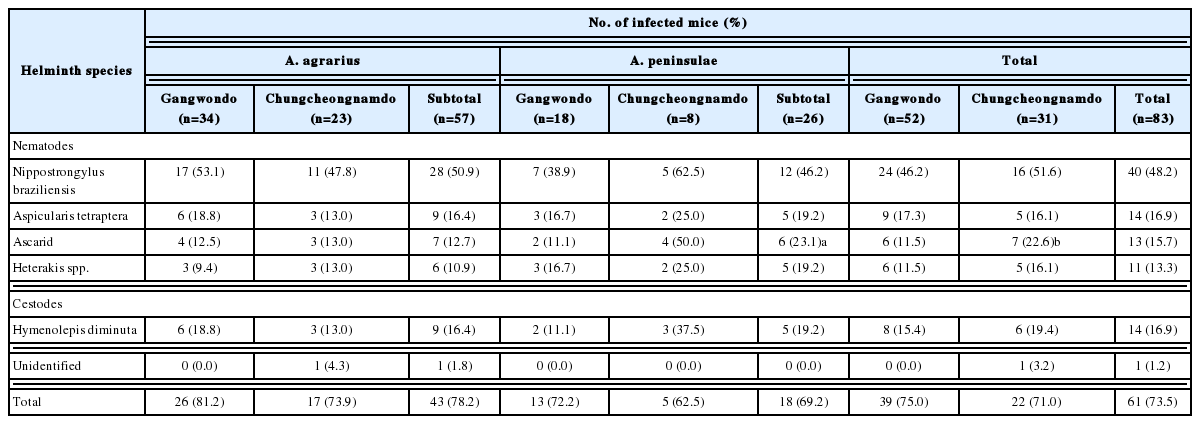 Table 1Helminth infection in the intestines of mice captured in agricultural fields near mountain in Gangwon-do and Chungcheongnamdo, Korea according to rodent host