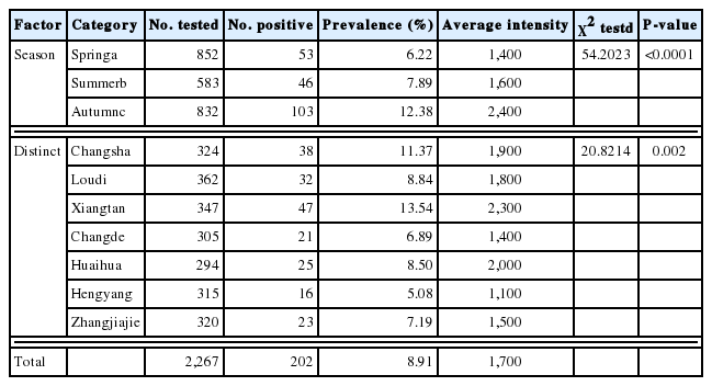 Table 1Prevalence of T. suis infection in pigs from different seasons and regions in Hunan province