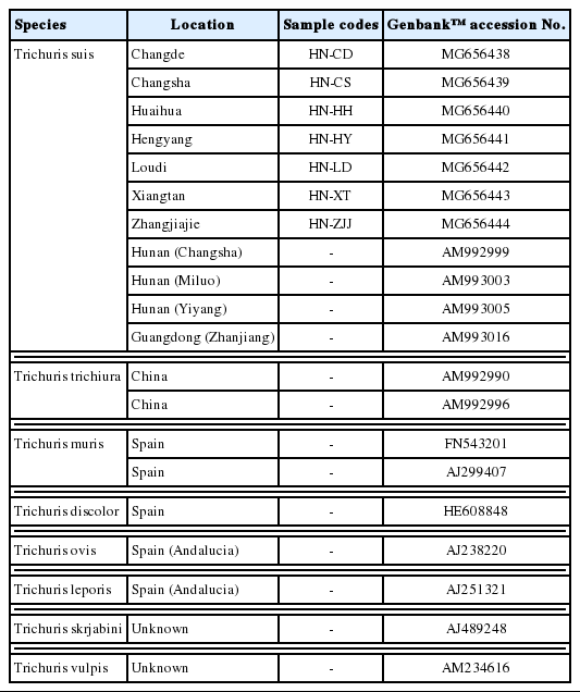 - 5. Liu GH, Zhou W, Nisbet AJ, Xu MJ, Zhou DH, Zhao GH, Wang SK, Song HQ, Lin RQ, Zhu XQ. Characterization of Trichuris trichiura from humans and T. suis from pigs in China using internal transcribed spacers of nuclear ribosomal DNA. J Helminthol 2014;88:64-68.