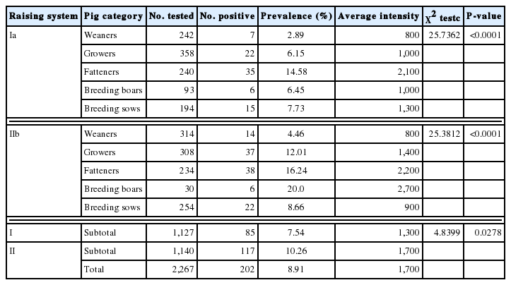 Table 1). A total of 2,267 pigs aged from 2 weeks to 3 years were selected randomly from representative intensive farms (the number of reared pigs>300) (n=7) and extensive farms (the number of reared pigs≤300) (n=21) from 7 different administrative regions in Hunan province (