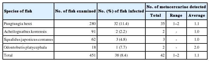 Isoparorchis sp. were detected in 38 (8.4%) out of 451 fish in 4 species, i.e.,