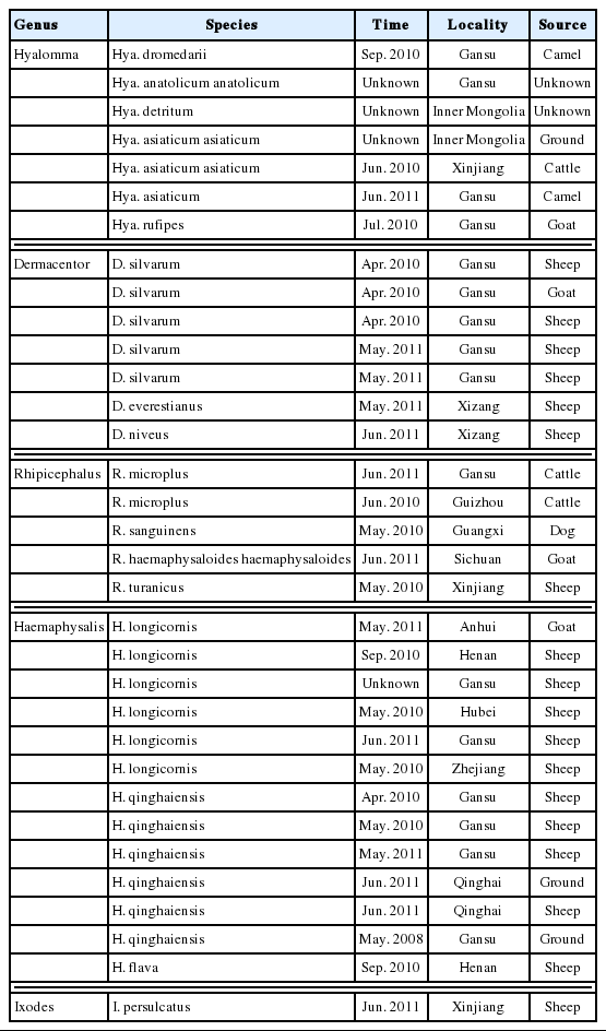 Ticks used in this study were collected from field sites and different hosts in various regions of China (
