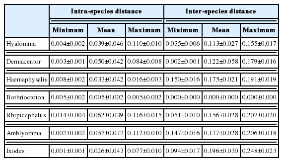 Rhipicephalus showed the highest mean intraspecies divergence (0.062±0.039) (