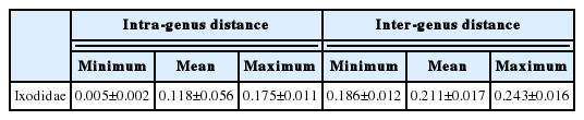 Table 3Measures of inter- and intragenus divergences for CO1 sampled in family Ixodidae