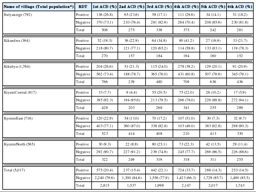 Name of village (Total population*) RDT 1st ACD (%) 2nd ACD (%) 3rd ACD (%) 4th ACD (%) 5th ACD (%) 6th ACD (%)