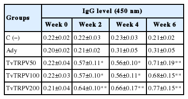 The humoral response to anti-recombinant TvTRPV show that antigen-specific IgG antibody response was significantly higher in the mice immunized with recombinant TvTRPV (TvTRPV50, TvTRPV100, and TvTRPV200 groups) at 2 weeks after the first immunization, compared to the control groups (IFA and C−) (