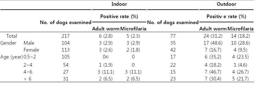 Table 2.Comparison of the prevalence of Dirofilaria immitis adult worms and microfilariae in indoor and outdoor dogs by age group