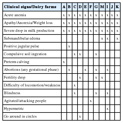 In all positive properties of this study, clinical signs associated with cattle death were observed. The most frequent clinical signs were apathy, anorexia, anemia, weight loss, abrupt drop in milk production, reproductive disorders and nervous signs (