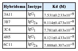 The antibody was isolated and purified from the ascites using ammonium sulfate precipitation method and protein-G column affinity chromatography. As a result of SDS-PAGE, bands were observed near 50 kDa and 25 kDa (data not shown), that correspond to the heavy chain and light chain in a usual antibody. Isotype and dissociation constants were determined to characterize the purified monoclonal antibodies (3A11, 3B7, 3C4, 4H5, 6C11). All monoclonal antibodies belonged in the IgG class and were confirmed to be isotypes IgG1 and IgG2a. The dissociation constants were determined 10−8–10−9, and the antibodies with the highest affinity were 3A11 and 3B7 (Table 1).