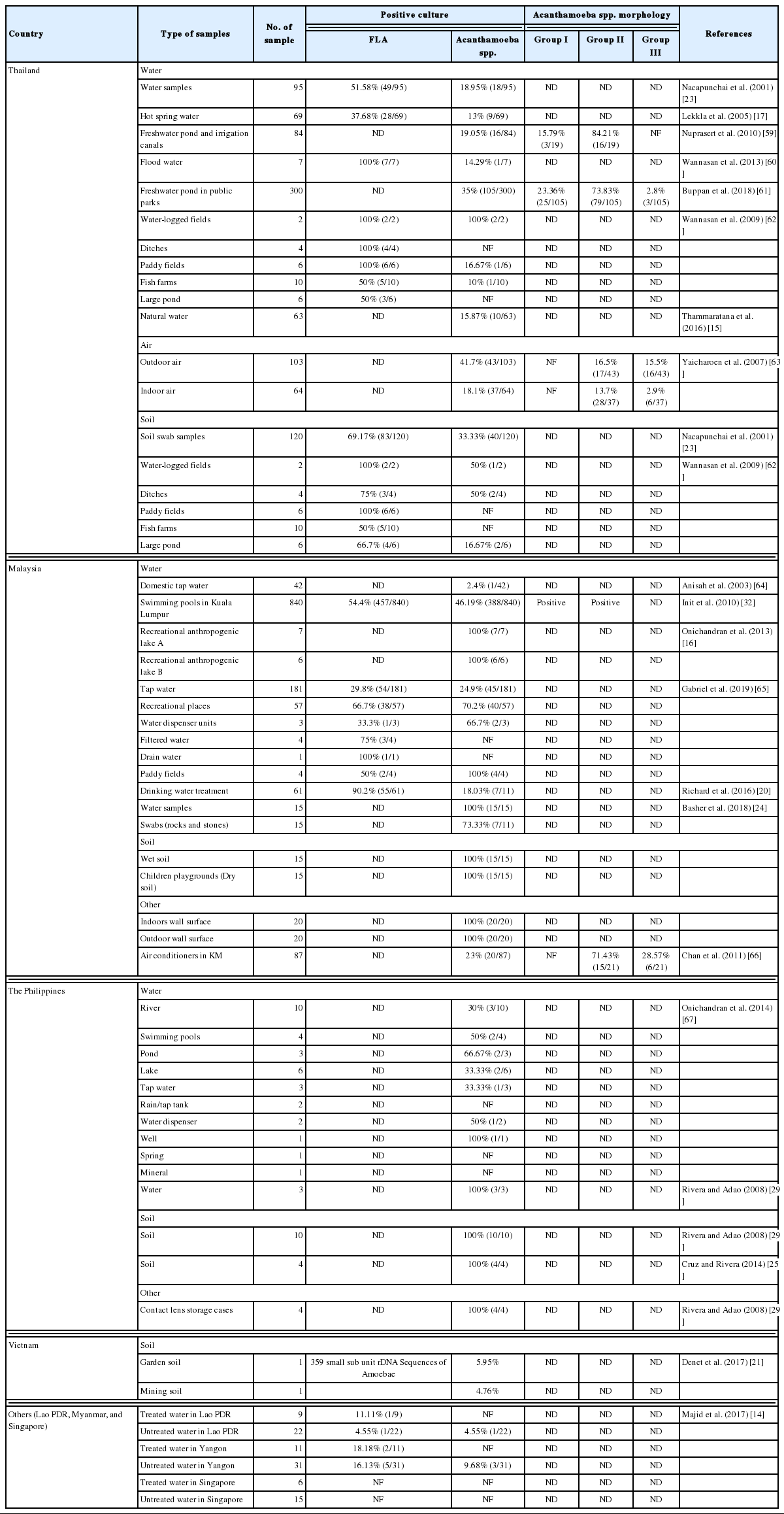 | Garden soil | 1 | 359 small sub unit rDNA Sequences of Amoebae | 5.95% | ND | ND | ND | Denet et al. (2017) [21] | |