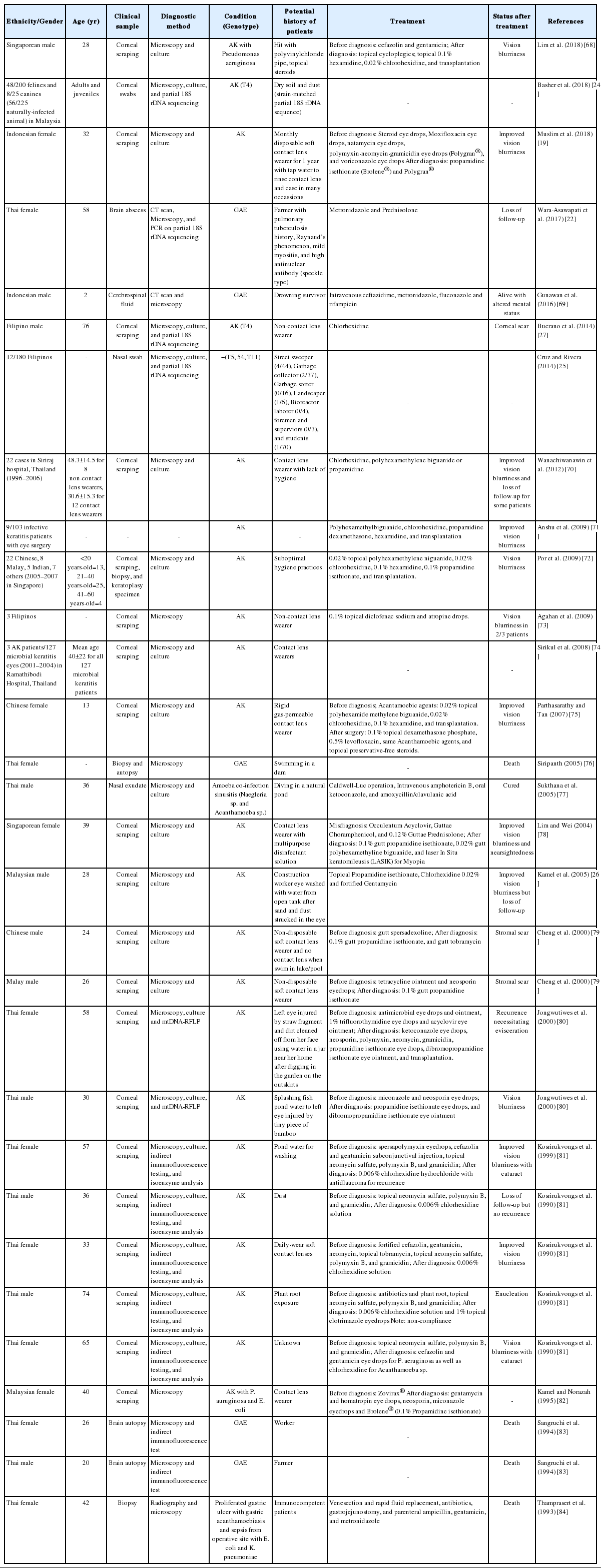 | Thai female | 57 | Corneal scraping | Microscopy, culture, indirect immunofluorescence testing, and isoenzyme analysis | AK | Pond water for washing | Before diagnosis: spersapolymyxin eyedrops, cefazolin and gentamicin subconjunctival injection, topical neomycin sulfate, polymyxin B, and gramicidin; After diagnosis: 0.006% chlorhexidine hydrochloride with antidlaucoma for recurrence | Improved vision blurriness with cataract | Kosrirukvongs et al. (1999) [81] |