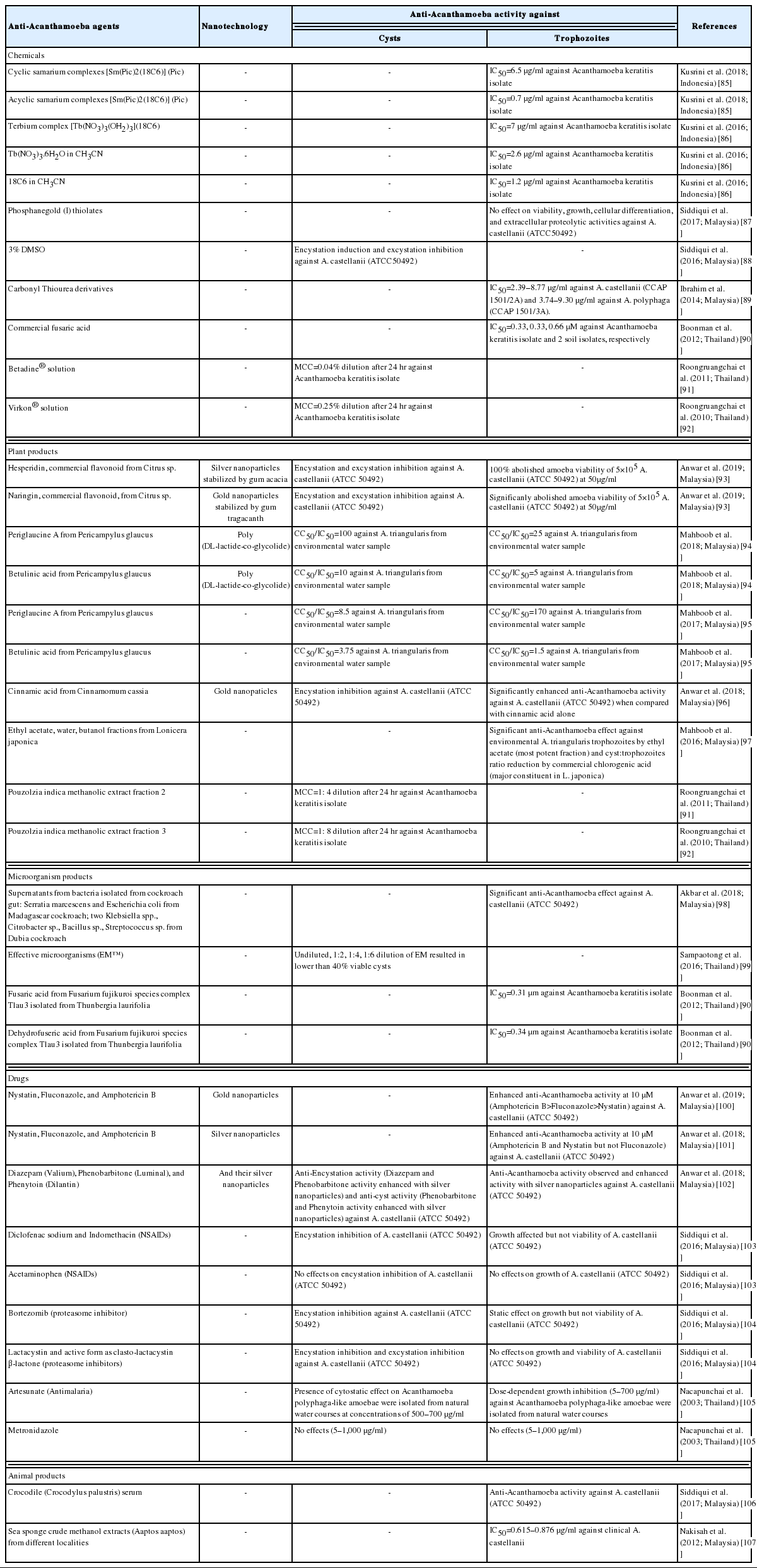 | Anti-Acanthamoeba agents | Nanotechnology | Anti-Acanthamoeba activity against | References | |