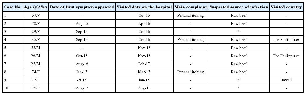 From October 2015 to August 2018, we covered 10 patients (cases 1–10) had felt the passage of the worms and found whitish yellow tapeworm segments in their underwear or feces. These individuals were admitted to Kyungpook National University Hospital, Keimyung University Dongsan Medical Center, local internal medicine clinic, and Sangju Red Cross Hospital.