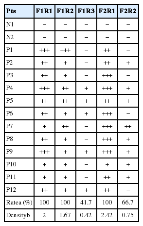 Table 1). Rate was determined as the detection rate for each fragment against positive patients’ sera. Density of the bands for each fragment against sera were measured as +, ++, and +++ arbitrarily, and scored into 1, 2, and 3. The averages were calculated and used as the final density. Fragments F1R1, F1R2, and F2R1 showed 100% rate of detection, and average density scoring of 2.00, 1.67, and 2.42 from a maximum of 3.0, respectively.