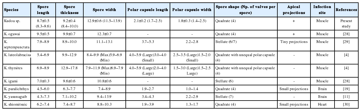 Kudoa ogawai was the most similar to the isolated species in terms of measurements and shape of spores, number of valves per spore, apical projection, and infection site.