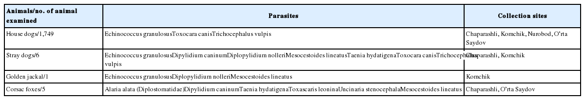 This study aimed to determine the prevalence of intestinal helminth parasitic infections and associated risk factors for the human infection among the people of Samarkand, Uzbekistan. Infection status of helminths including Echinococcus granulosus was surveyed in domestic and wild animals from 4 sites in the Samarkand region, Uzbekistan during 2015–2018. Fecal samples of each animal were examined with the formalin-ether sedimentation technique and the recovery of intestinal helminths was performed with naked eyes and a stereomicroscope in total 1,761 animals (1,755 dogs, 1 golden jackal, and 5 Corsac foxes). Total 658 adult worms of E. granulosus were detected in 28 (1.6%) dogs and 1 (100%) golden jackal. More than 6 species of helminths, i.e., Taenia hydatigena, Dipylidium caninum, Diplopylidium nolleri, Mesocestoides lineatus, Toxocara canis, and Trichuris vulpis, were found from 18 (1.0%) dogs. Six (T. hydatigena, Toxascaris leonina, Alaria alata, Uncinaria stenocephala, D. caninum, and M. lineatus) and 2 (D. nolleri and M. lineatus) species of helminths were also detected from 5 Corsac foxes and 1 golden jackal, respectively. Taeniid eggs were found in 2 (20%) out of 10 soil samples. In the present study, it was confirmed that the prevalences of helminths including E. granulosus are not so high in domestic and wild animals. Nevertheless, the awareness on the zoonotic helminth infections should be continuously maintained in Uzbekistan for the prevention of human infection.