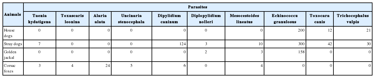 Table 2Helminth parasites isolated from the intestine of dogs and wild animals captured in the Samarkand region from 2015 to 2018