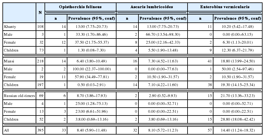 Table 1. Briefly, the opisthorchiasis infection rate was the highest in the Khanty (13%), intermediate in Russian old-timers (8.4%) and the lowest in the Mansi (6.4%) though the differences in opisthorchiasis prevalence between the indigenous population and Russian old-timers were not statistically significant (χ