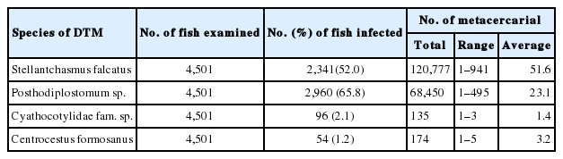 - 11. Sohn WM. Fish-borne Zoonotic trematode metacercariae in the Republic of Korea. Korean J Parasitol 2009;47:103-113.