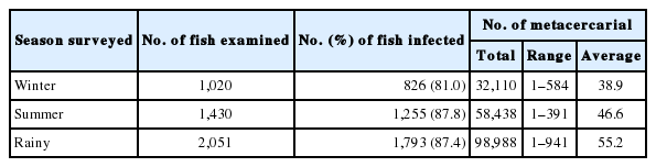 The infection rate varied with seasons. A high infection rate was found during both summer (April–May) and rainy (June–October) seasons, with a prevalence greater than 87%, whereas the highest mean intensity was found during the rainy season at about 55.2 metacercariae per fish infected. The winter season (November–March) had the lowest infection rate of about 81.0% and the mean intensity was 38.9 metacercariae per fish infected (