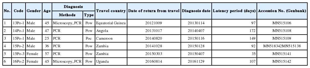 In this study, we report the diagnosis and genetic analysis of P. ovale imported from West and South Africa between 2013 and 2016. Six patients (4 males and 2 females; 25–57 years old) infected with P. ovale were collected for this study (Table 1). The patients had recently visited Equatorial Guinea, Angola, Cameroon, Zambia, or Uganda for missionary activity or business trips. According to the US CDC’s Yellow Book [12], malaria with chloroquine resistance have been reported in all these countries. P. ovale represents 5 to 15% of all Plasmodium spp. in these countries.
