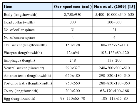 Only 1 adult specimen of H. alincia (Echinostomatidae) was obtained, which was slender and elongated, 8.75 mm long and 0.93 mm wide (Table 2; Fig. 1B). The size of uterine eggs (n=10) was 98–110 (104) μm long and 65–70 (68) μm wide. It characteristically had a prominent head collar equipped with a crown of 31 collar spines (including 4 end group spines on each side). Two tandem testes were located near the terminal portion of the body, and vitellaria were distributed from the posterior extremity up to the posterior level of the cirrus sac.