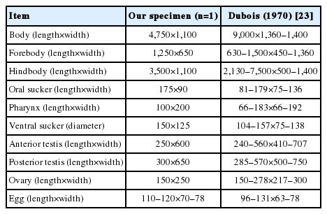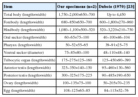 Measurements (μm) of Cryptocotyle lingua (adults) in comparison with a previous report