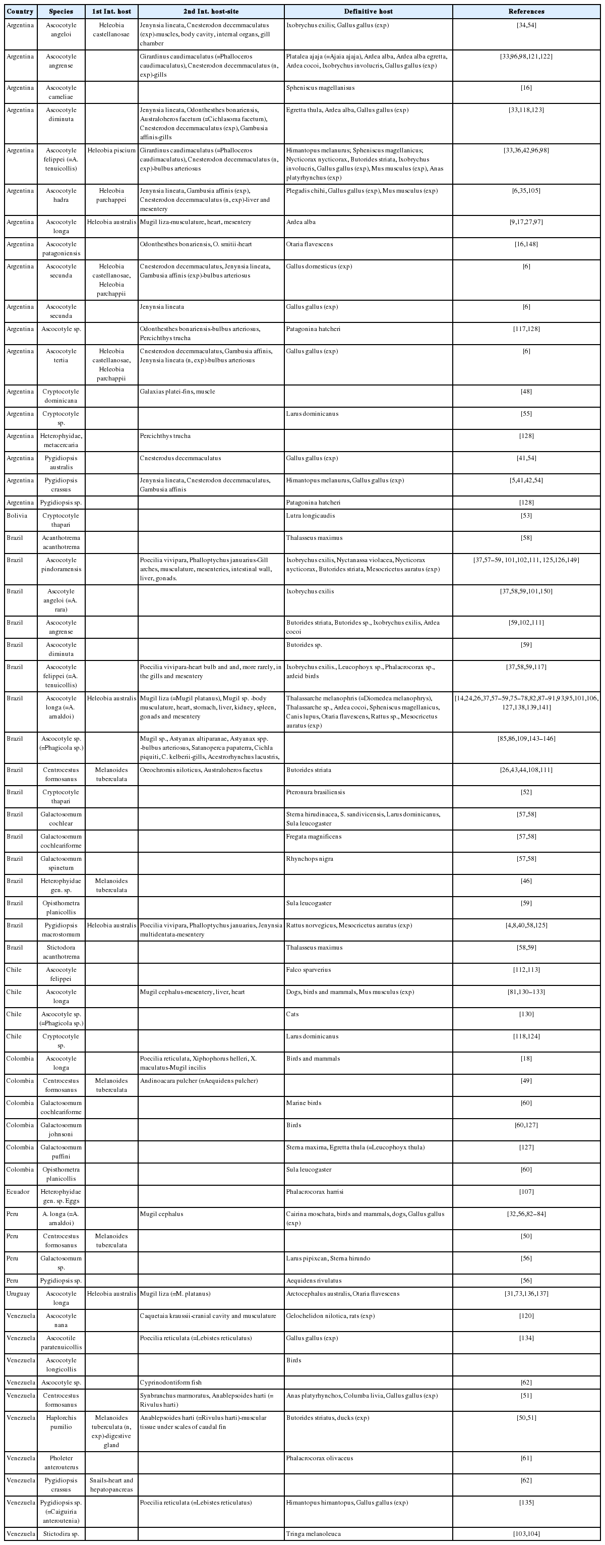 Species of the genus Ascocotyle are the most prevalent in SA and include Ascocotyle angeloi Travassos, 1928 (syn. A. rara), Ascocotyle angrense Travassos, 1916, Ascocotyle cameliae Hernández-Orts, Georgieva, Landete & Scholz, 2019, Ascocotyle diminuta (Stunkard & Haviland, 1924), Ascocotyle felippei Travassos, 1928, Ascocotyle hadra Ostrowski de Núñez, 1992, Ascocotyle longa Ransom, 1920, Ascocotyle patagoniensis Hernández-Orts, Montero, Crespo, García, Raga & Aznar, 2012, Ascocotyle pindoramensis (Travassos, 1928), Ascocotyle secunda Ostrowski de Núñez, 2001 and Ascocotyle tertia Ostrowski de Núñez, 2001.