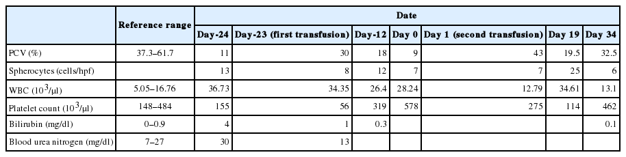 Twenty-five days after the first transfusion, the dog’s mPCV decreased to 9%; therefore, a second blood transfusion was needed. The immunochromatographic blood typing test (Quick Test Blood Typing; Alvedia, Limonest, France) revealed that the dog had erythrocyte antigen (DEA)-1-negative blood. Because it was impossible to obtain DEA-1-negative blood from the commercial blood bank in Korea, packed red blood cells (RBC) were collected from a clinic-owned dog used as a blood donor. The donor lived indoors but was occasionally exposed to the outdoors; furthermore, it had undergone regular control of ectoparasites and was negative for