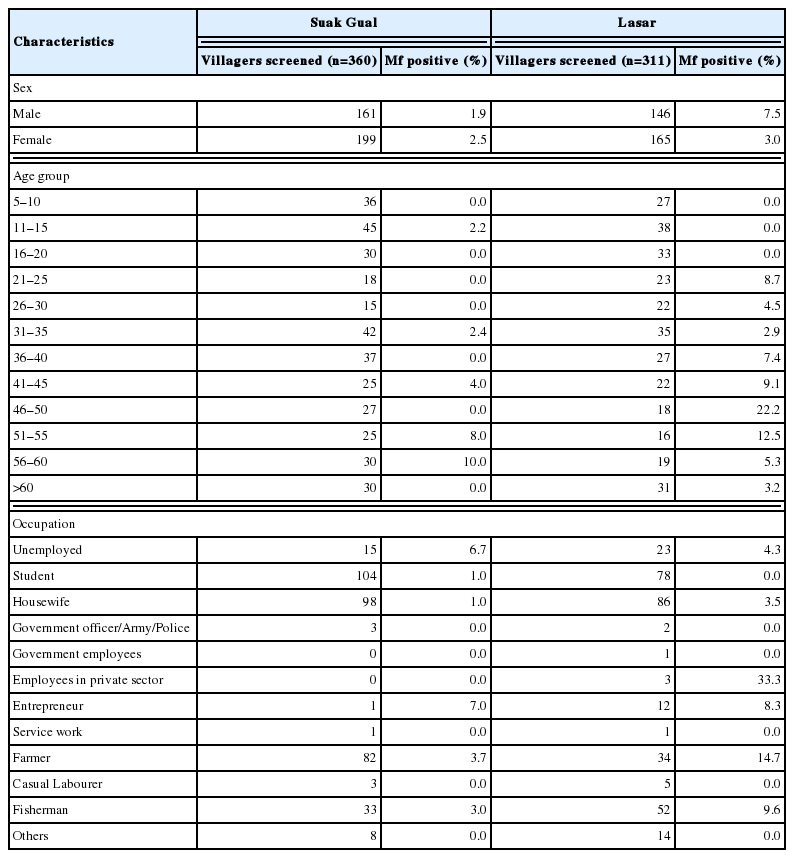 A total of 671 people living in Suak Gual in Mendanau Island and Lasar in the mainland participated in the Mf survey. Out of the total sample, females consisted 54% (362) while the remaining (309; 46%) were males. In both the villages, more females participated than males (
