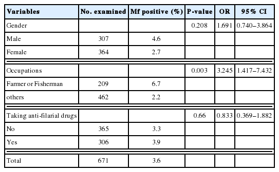 Individuals with Mf-positive by occupations were farmers of 33%, fishermen of 25%, housewives of 17%, and others of 25%. As the farmers and fishermen were the major occupational group, the Mf prevalence in this group was compared with the rest. The Mf prevalence among farmers and fishermen was 6.7% which was significantly higher than 2.2% among others. Mf prevalence was comparable between those who reported to have participated in MDA programme (