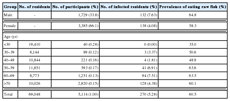 C. sinensis infection in male was significantly higher than in female residents, which this trend was showed in all towns and villages in Haman-gun. As regards of ages, egg positivity in fifties was the highest group in ages, followed 60 and over 70, suggesting that the habit of eating raw freshwater fish remains common in older inhabitants of the region.