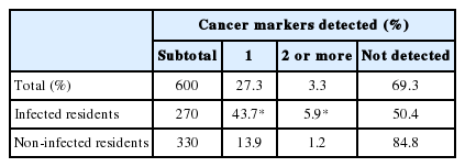 C. sinensis infection and carcinogenesis, we estimated the positivity of the cancer biomarkers CA19-9, ferritin, and CYFRA 21-1 in the serum of residents. We found that 43.7% of infected resident were positive to single biomarker and 5.9% were positive to 2 or more biomarkers, which were significantly higher proportions than among non-infected residents (13.9% and 1.2%, respectively) (