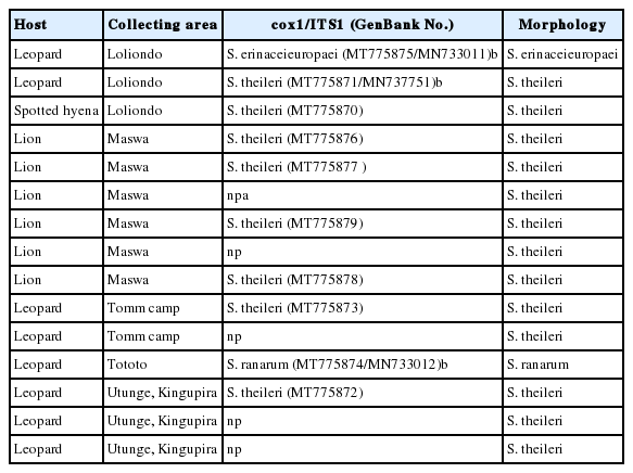 - 17. Eom KS, Park H, Lee D, Choe S, Kang Y, Bia MM, Ndosi BA, Nath TC, Eamudomkarn C, Keyyu J, Fyumagwa R, Mduma S, Jeon HK. Identity of Spirometra theileri from a leopard (Panthera pardus) and spotted hyena (Crocuta crocuta) in Tanzania. Korean J Parasitol 2019;57:639-645. https://doi.org/10.3347/kjp.2019.57.6.639