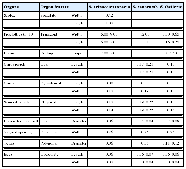 Table 2Morphometric features of 3 Spirometra species from carnivorous mammals in Serengeti National Park of Tanzania (unit=mm)