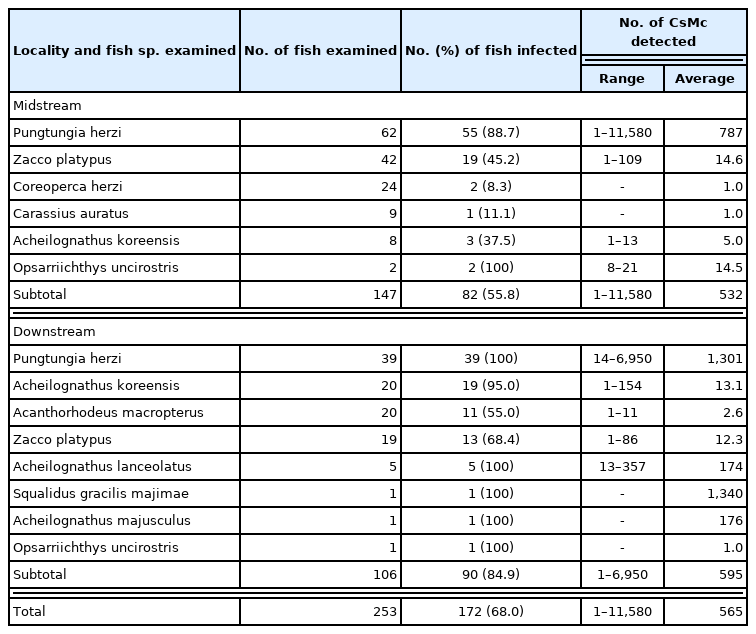 By the present study, it was confirmed for the first time that CsMc are highly endemic in fishes from Yongjeon-cheon, in Cheongsong-gun, Gyeongsangbuk-do, Korea. The infection status was revealed with a certain tendency by the subfamily groups, i.e., Gobioninae, Acheilognathinae and Rasborinae, in the cyprinid fish (family Cyprinidae) hosts of