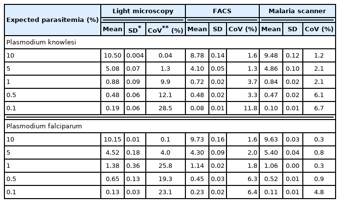 Fig. 2C, D). The data showed that 0.06% of parasitemia has a CoV greater than 30, which was not considered an acceptable value (CoV <10). Moreover, parasitemia below 0.1% gave a measurement error that detected higher parasitemia than the actual number (data not shown).