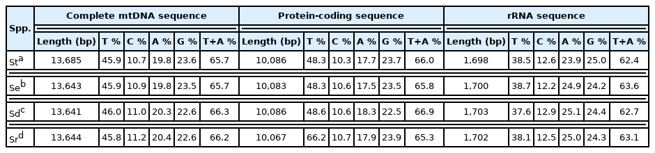 Table 1 Nucleotide compositions of the complete mitochondrial genomes, protein-coding genes, and ribosomal RNA sequences of 4 Spirometra species