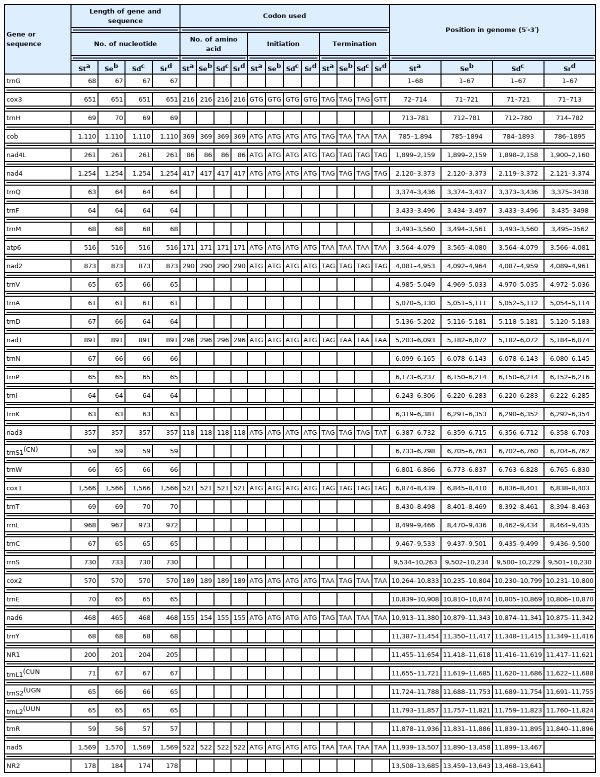Table 3 Codon usage in the 12 protein-coding genes of the mitochondrial genomes of Spirometra species